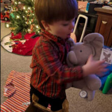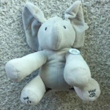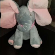 It was gifted to my almost 4-month-old son for Christmas this year. The voice of the elephant is very sweet and not annoying like some toys. It is a loud volume and piques the baby’s interest. The ears cover the eyes and pass for a second before opening up. I like that it has buttons on the feet for singing or playing. It is crazy soft. So soft I almost dropped it a couple of times lol.